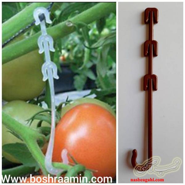 این قلاب پلاستیکی و با دوام دارای عمر طولانی میباشد و کاربرد آن بسیار ساده و سریع است فقط کافیست قسمت بالای قلاب که به صورت چند شاخه است به نخ محصول آویزان شودو قسمت انتهایی آن قلاب مانند است به خوشه وصل شود به این طریق وزن خوشه به نخ منتقل میشود و از آسیب رسیدن به خوشه مخصوصا گوجه فرنگی جلوگیری به عمل می آید