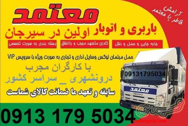 با یک تماس آسوده خاطر اسباب کشی کنید . با تخفیف 20 درصد رضایت شما هدف ما میباشد حمل بار حمل اثاثیه منزل و اسباب کشی با اتوبار مجهز درونشهری و برون شهری .ایسوزو خاور بزرگ 8 تن . کارگران ایرانی مجرب با سالها تجربه . باز و بست تخصصی درب انواع یخچال ساید با نیروی دوره دیده . حمل بار و کالای شما با بیمه نامه رسمی و بارنامه دولتی . شبانه روزی بدون تعطیلی سرویس دهی به تمام نقاط سیرجان و شهرستان ها با بیمه و بارنامه دولتی کار را به کاردان بسپارید و اسباب کشی آسان را با ما تجربه کنید . حمل تخصصی اثاثیه منزل و مبلمان وجهیزیه عروس با کارگران متخصص و با ادب . با بیمه نامه رسمی و بارنامه دولتی . حمل تخصصی ساید بای ساید گاوصندوق تردمیل بوفه شیشه نهارخوری ولوازم ظریف و حساس با کارگران متخصص کارگر خالی جهت تخلیه و بارگیری بارهای شهری شهرستان وانت. نیسان. خاور شبانه روزی بدون تعطیلی سرویس دهی شبانه روزی بدون تعطیلی با ماشین های مجهز به کانتینرهای سرپوشیده و موکت کاری شده وپتودار مخصوص اثاثیه و مبلمان وجهیزیه عروس