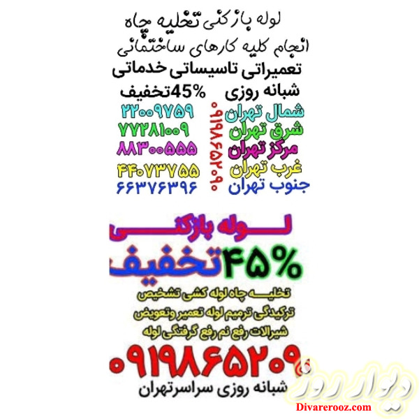 لوله بازکنی لوله کشی تخلیه چاه تعمیر تعویض شیرالات تشخیص ترکیدگی لوله بادستگاه وترمیم ورفع نم کاشی کاری ورفع بدی بد لوله ها و….09193476424 تمام نقاط تهرانلوله کشی بلوار شاهین شمالی 44073755تشخیص ترکیدگی لوله بادستگاه 45%تخفیف شبانه روزی 09198652090-لوله کشی بلوارفردوس-لوله کشی پونک-لوله کشی جنت اباد-لوله بازکنی شاهین شمالی-رفع نم رفع چکه-ترمیم ترکیدگی -لوله بازکنی غرب تهران 44273828-لوله کشی شقایق-فنرزنی با دستگاه -بدون تعطیلی سرویسدهی کمتراز 20دقیقه