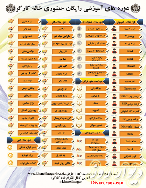 آموزش رایگان دوره های آموزشی به صورت کوتاه مدت یکماهه و در رشته های کامپیوتر، زبان، حسابداری، هنری و فنی در قالب بیش از 500 دوره متنوع به صورت مجازی و حضوری در سراسر کشور، به همراه خدمات متنوع مهمان سرا با تخفیف ویژه، خدمات بیمه ای ، خدمات تعاونی و .......
