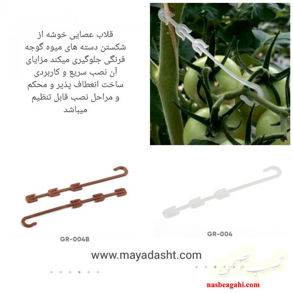 به کمک قلاب نگهداری خوشه وزن خوشه به نخ منتقل شده و ازآن به منظور جلوگیری از قطع و صدمه دیدن خوشه گیاه به کمک اتصال این قلاب به زیر میوه و نخ گلخانه استفاده میشود.