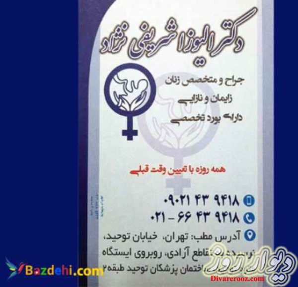متخصص زنان در میدان آزادی دکتر الیوزا شریفی نژاد جراح و متخصص زنان ،زایمان و نازایی دارای بورد تخصصی از دانشگاه علوم پزشکی ایران آدرس مطب:تهران،خیابان توحید، نرسیده به تقاطع آزادی، روبروی ایستگاه مترو توحید، ساختمان پزشکان توحید، طبقه دوم تلفن: 66439418-021 09021439418 همه روزه،به جز ایام تعطیل با تعیین وقت قبلی عملکرد طبیعی هورمون ها در بدن یک فاکتور اساسی برای باردار شدن است . شایع ترین عامل بر هم ریختن عملکرد طبیعی هورمونـ ، پیـری است . صحبــت های زیادی که در مورد (( ساعت بیولوژیکی )) شده اســت همگی حقیقت دارند .