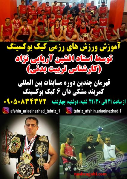 آموزش ورزش های رزمی کیک بوکسینگ درتبریز توسط استاد افشین آریایی نژاد قهرمان چندین دوره مسابقات بین المللی و کاپ آزاد اوروآسیا رئیس سبک کیک لایت کیک بوکسینگ استان آذربایجان شرقی (کارشناس تربیت بدنی) آموزش خصوصی و عمومی در تمامی رده های سنی آموزش مبارزات آزاد رینگی