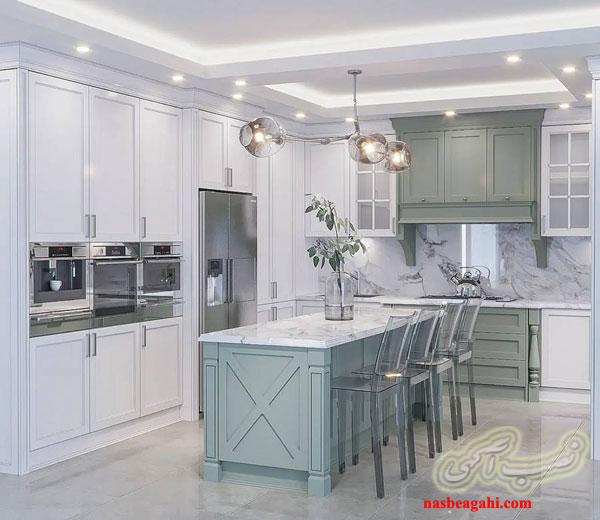 در سبک کلاسیک طرح هود آشپزخانه و اوپن جزیره و دربهایی و ویترین مهم بوده و زیبایی خاصی به این سبک کابینت میدهد